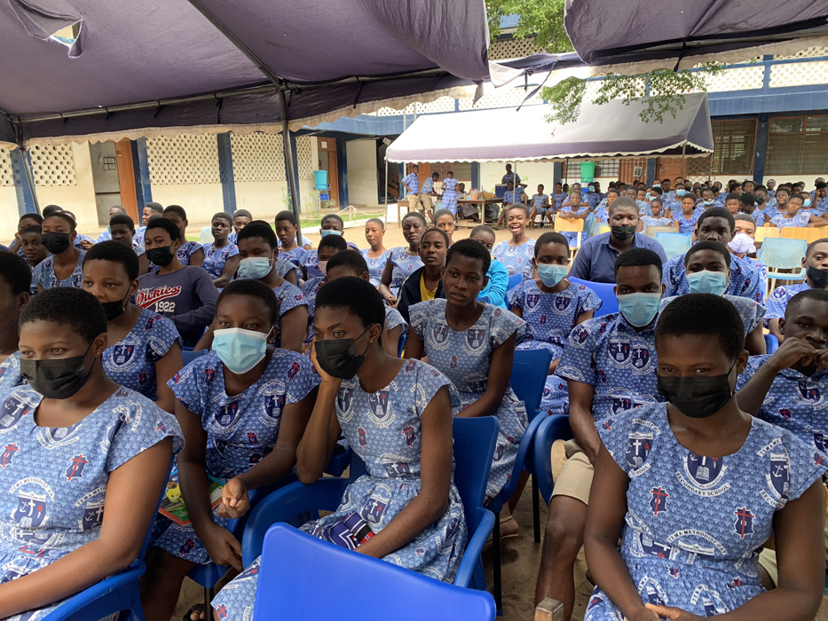 Hon. Yves Nii Noi Hanson-Nortey member of parliament for Tema Central Constituency with students of Our Lady of Mercy Senior High School at the Meridian Enclave